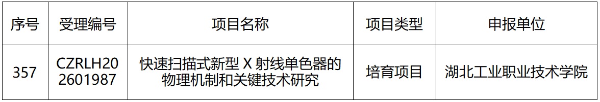 新闻网讯(通讯员 邢宏珍)近日,湖北省科技厅公布了2026年度湖北省自然科学基金拟立项项目名单,我校王圣浩博士主持的项目《快速扫描式新型X射线单色器的物理机制和关键技术研究》获批立项。